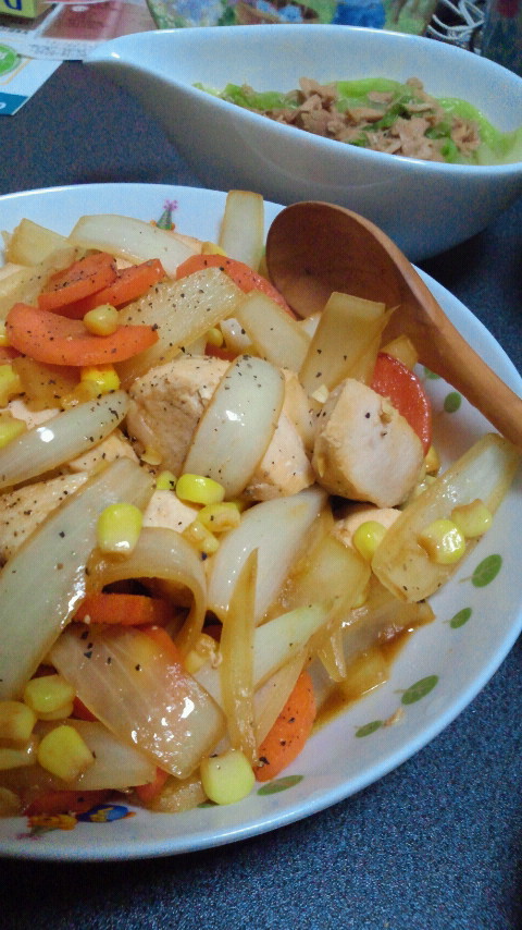 4、同じフライパンに、キャベツ半量と玉ねぎを敷き、その上に焼いた鶏肉を乗せます。