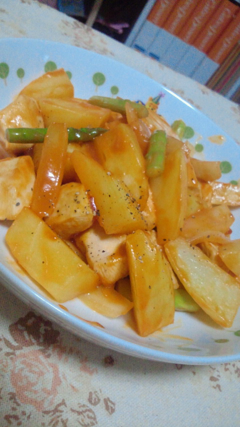 玉ねぎを加えてざっと炒め、アスパラとジャガイモを戻しいれて、炒め合わせます。