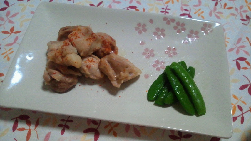 5、それぞれお皿に盛り付け、鶏肉に一味唐辛子をふりかけて完成。