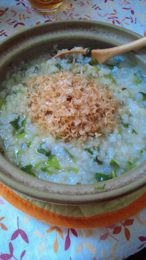 4、お米が水分を吸って柔らかくなったら塩で味を調え、かつお節をのせて完成!