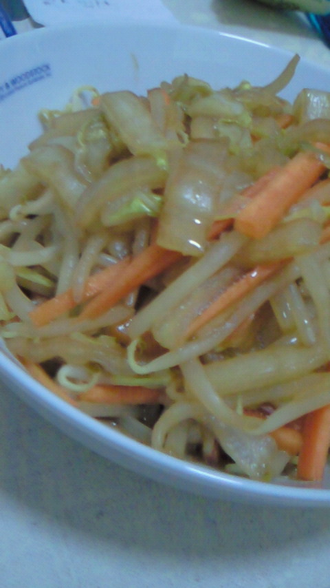 6、そのままのフライパンで、タマネギ、ニンジン、キャベツを炒めます。