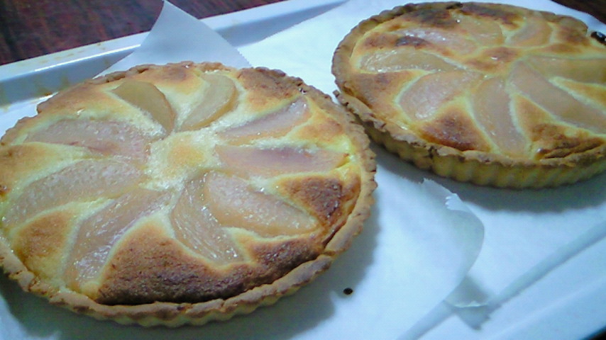 タルトの中にカスタードクリームとアーモンドクリームをつめて桃のコンポートをのせて焼いたタルトです!