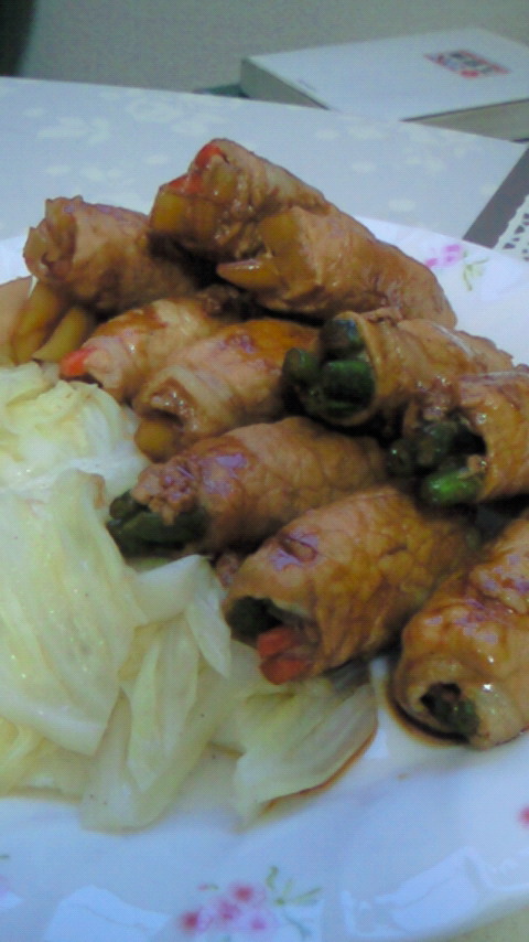 豚肉でインゲンとニンジンを豚肉で巻きます。